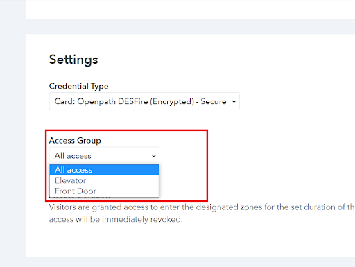 For Openpath DESFire (Encrypted) - Secure, Openpath MIFARE (CSN) - Fast and PIN code, select the access group that will be used.